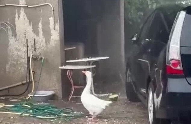 В Испании неожиданный ливень с градом ошарашил не только людей, но и гуся, который слишком близко познакомился с ледяной глыбой.