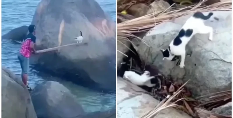 Один мужчина снял котика с камня на берегу моря, после чего передал пушистого его маме. Но она была не в восторге от действий малого, после чего решила провести «урок воспитания».