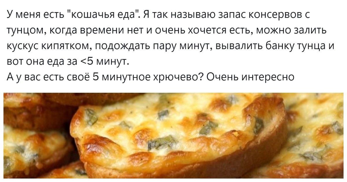 Чтобы соорудить что-то подобное, обычно уходит масса времени. Но практически у каждого есть в запасе пара-тройка рецептов секретных блюд-десяти- или даже пятиминуток, которые позволяют соорудить что-то более или менее внятное, когда времени кашеварить совершенно нет. Пользователи рассекретили свои тайные рецепты. Некоторые оказались неожиданными, но вполне себе имеющими право на существование.
