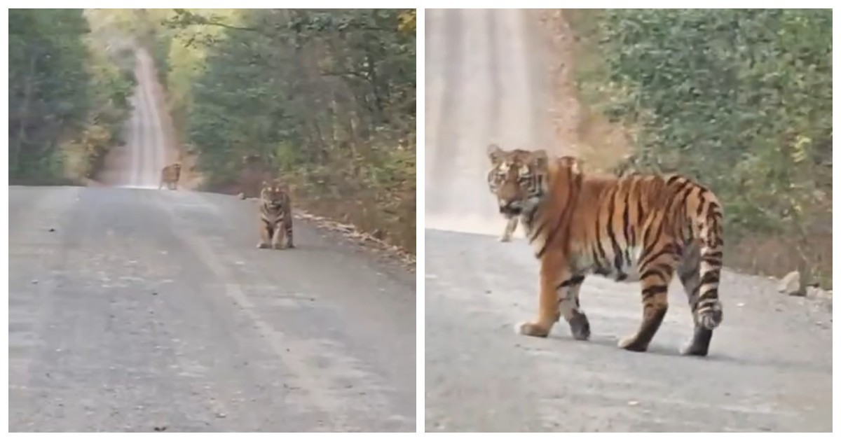В Приморье два тигра неожиданно остановили автомобиль, вызвав удивление и восторг у проезжавших мимо людей. Пассажиры не могли отвести взгляд от этих полосатых хищников и на некоторое время задержались на месте.
