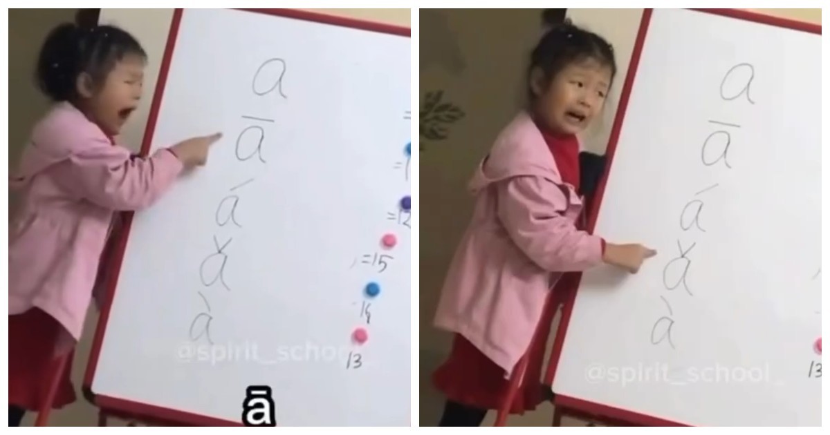 На видео ребёнок пытается правильно произносить китайские тона, но всё время сбивается и смеётся. В комментариях другие изучающие китайский язык поддержали девочку, делясь похожими трудностями.