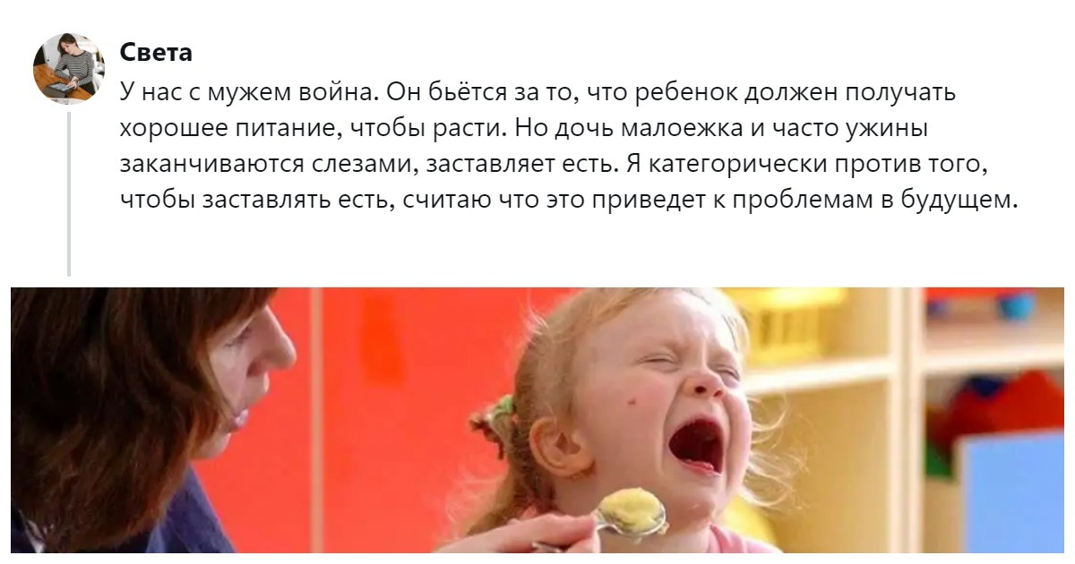 Наверняка подобные аргументы помнят многие из вас. А какие ещё могли использовать родители, пытаясь запихнуть в рот любимого чада лишнюю ложку еды? Времена меняются, но детей-малоежек не становится меньше. Даже наоборот. И теперь уже современные родители придумывают уловки. Но не все. Часть предпочитает отстать от ребёнка, если он, конечно, вышел из младенческого возраста. И не заставлять его есть насильно исходя из побуждений, о которых многие говорят, но мало кто может доказать их практическую пользу. Пользователи тоже столкнулись с такой дилеммой и попытались выяснить, нужно ли насильно кормить детей, или лучше отстать от них – всё равно поедят, когда проголодаются. И перерастут этот сложный период.