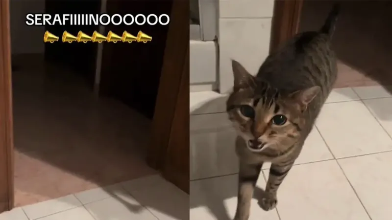 Стоит только автору видео протяжно позвать «Сераф-и-и-и-и-но», и к ней устремляется самый обаятельный усатый итальянец. Котейка каждый раз выводит мелодичные трели, когда его зовут, радуя владелицу мини-концертами.