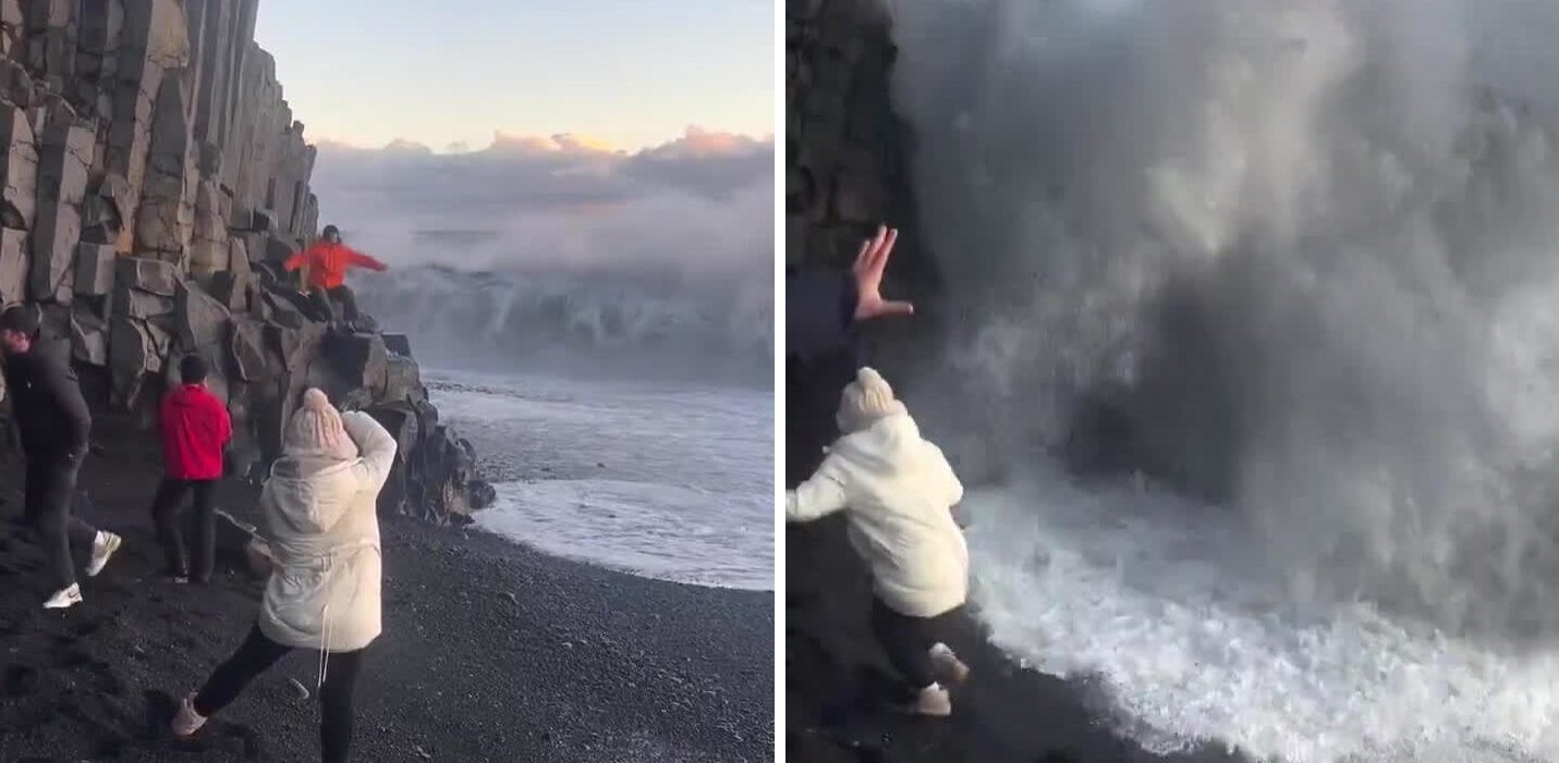 Мощная штормовая волна обрушилась на пляж Рейнисфьяра — одно из самых популярных, но в то же время самых опасных туристических мест Исландии — унеся нескольких посетителей в океан.