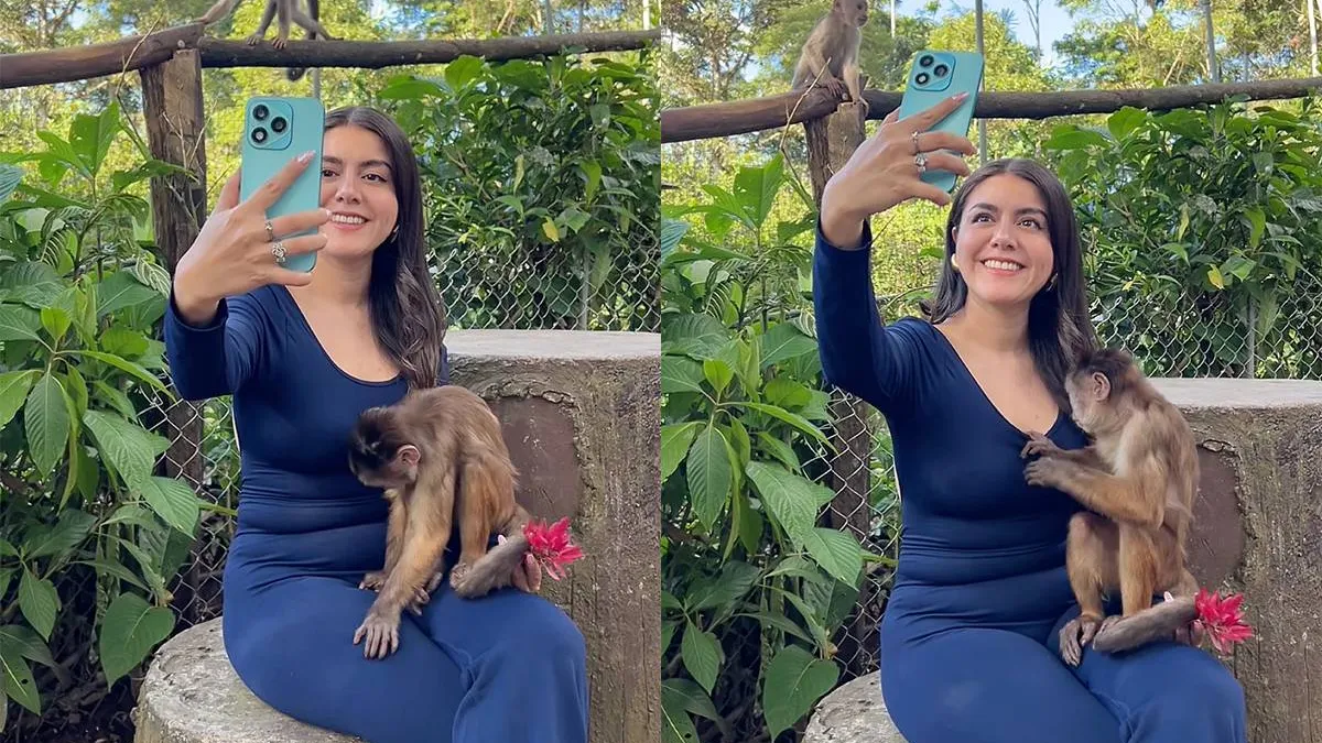Маленькая обезьянка забралась на колени посетительницы и начала исследовать окружающее пространство. В итоге она достала из-под рубашки прокладку для бюстгальтера, вызывая смех и удивление у женщин и свидетелей.