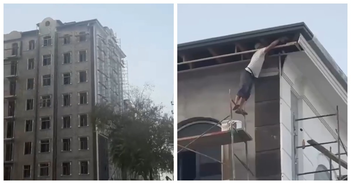 В Узбекистане засняли местного рабочего, который стоял в тапочках на краю строительных лесов
