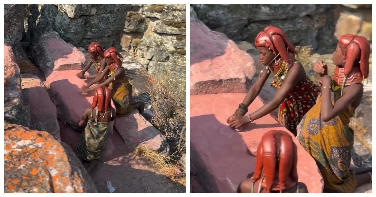 Сбор охры начинается с рассветом: девушки разбивают камни молотками, измельчают в порошок на плоских гранитных плитах, просеивают через сито из коровьего хвоста.