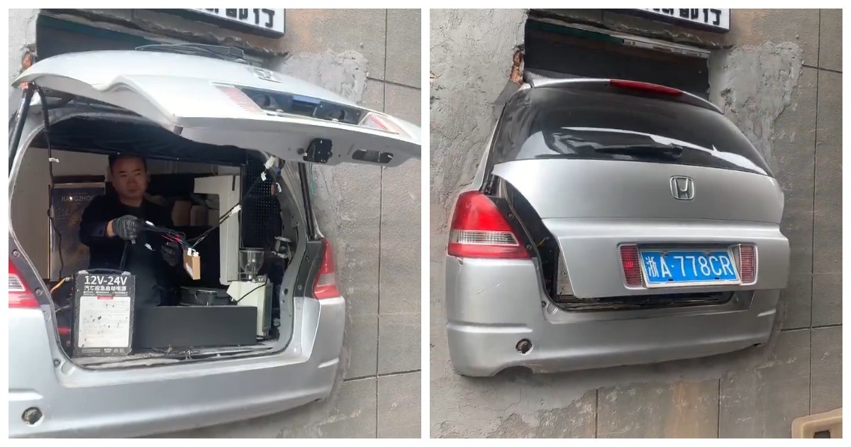 Небольшое кафе с большой идеей: в его дизайне использован настоящий автомобиль — багажник превращён в дверь, которая открывается как в машине.