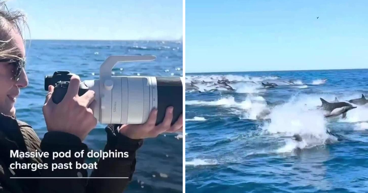 В Калифорнии случайно запечатлели, как тысячи дельфинов пронеслись мимо лодки
