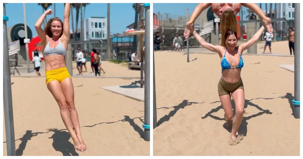 На видео девушки продемонстрировали настоящий мастер-класс силы и координации. Одна из них висела вверх ногами на турникете, выполняя шпагат, в то время как другая держалась руками за её ноги. Всё выглядело почти легко, но на деле требовало огромной силы, баланса и гибкости.