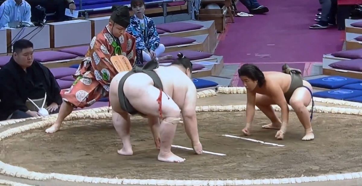 Косей пошёл в атаку, заставив соперника отступать. В итоге он вытолкал Амамидакэ за пределы площадки и одержал победу.