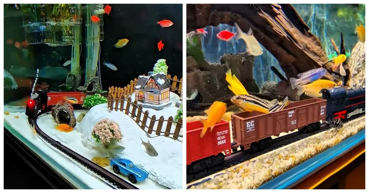 Теперь маленький поезд нарезает круги, останавливается на «станциях», а рыбки гоняются за ним, иногда забираясь прямо в вагончики и «тусят» внутри них.