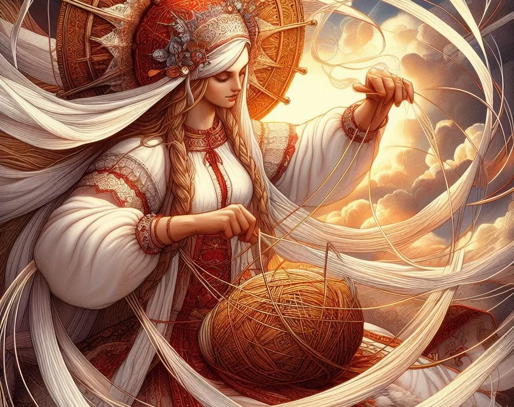 В то время как Перун сотрясал небеса молниями, а Велес скрывал сокровища глубоко в земных недрах, Макошь тихонько занималась своим делом — плетением нитей человеческих судеб, создавая незримое полотно мироздания.