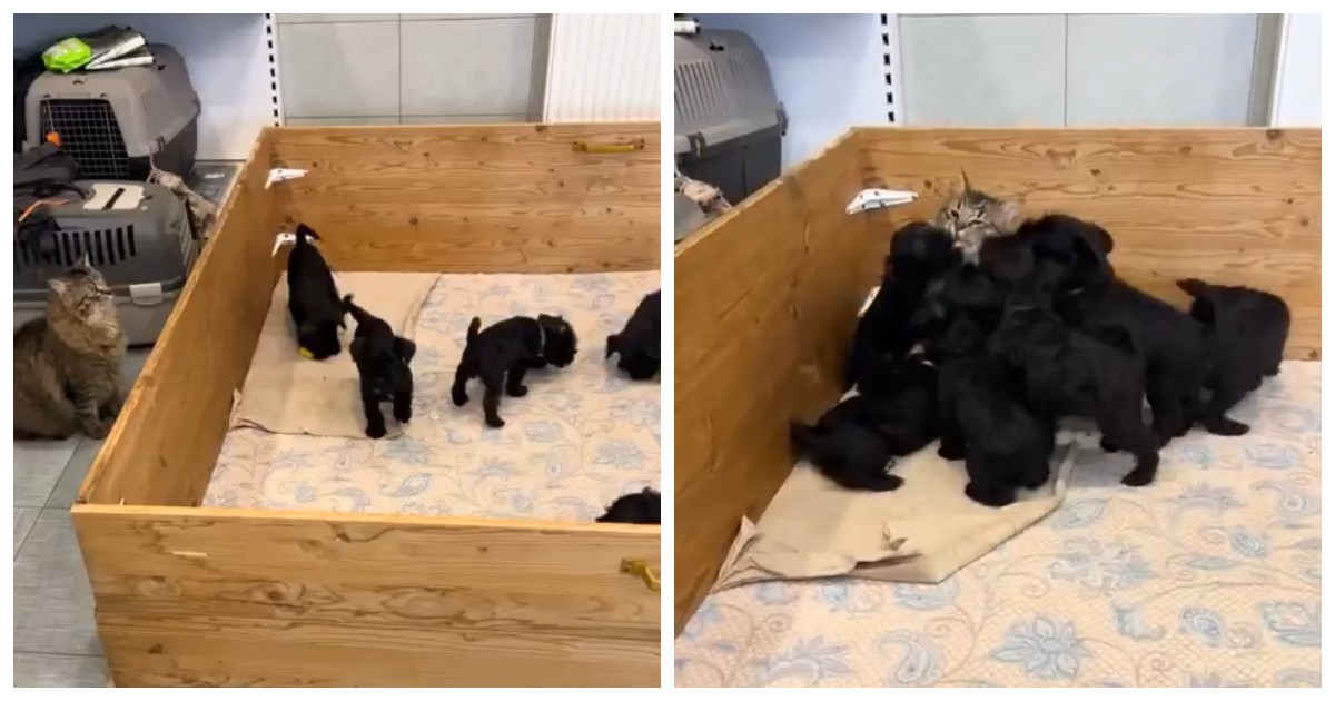 Кошка целенаправленно прыгнула в коробку, где находились щенки, и оказалась среди них, оставаясь в непосредственной близости с малышами, которые тесно сгруппировались вокруг неё.