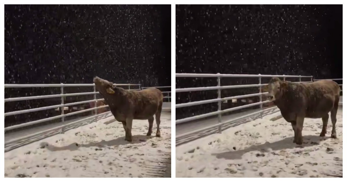 Корова пытается поймать снежинки — Интересные новости