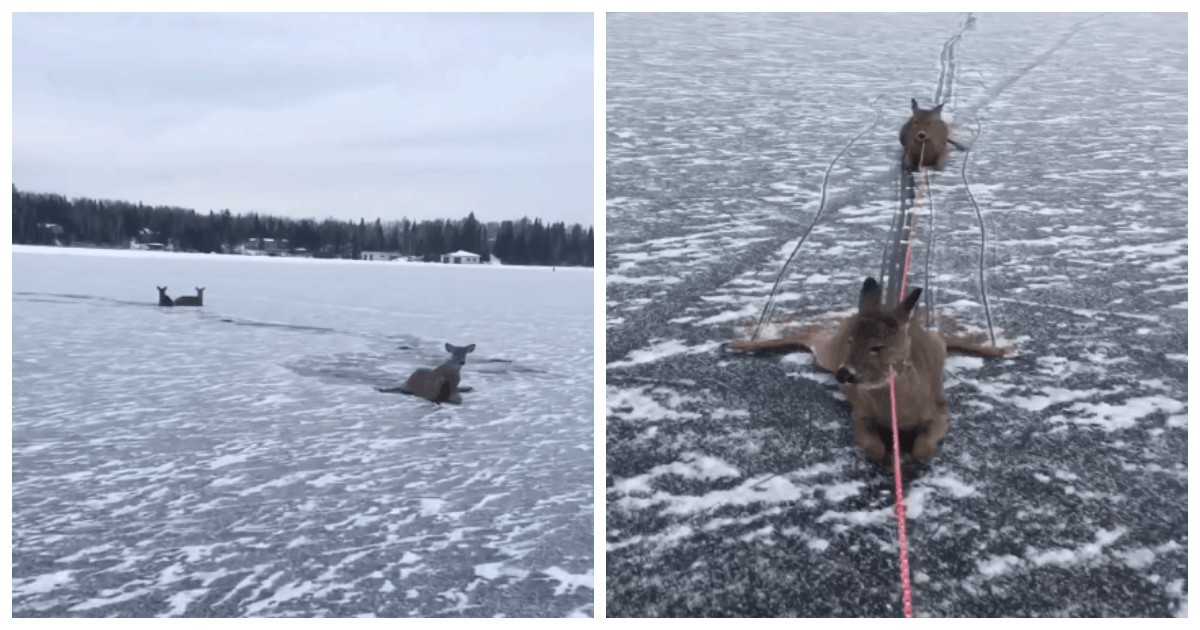 Конькобежец не оставил оленей в беде. С помощью веревки мужчина взял на буксир парнокопытных и доставил их до ближайшего берега. Несчастных пришлось буквально выталкивать на берег, иначе измученные олени не могли выбраться со льда.