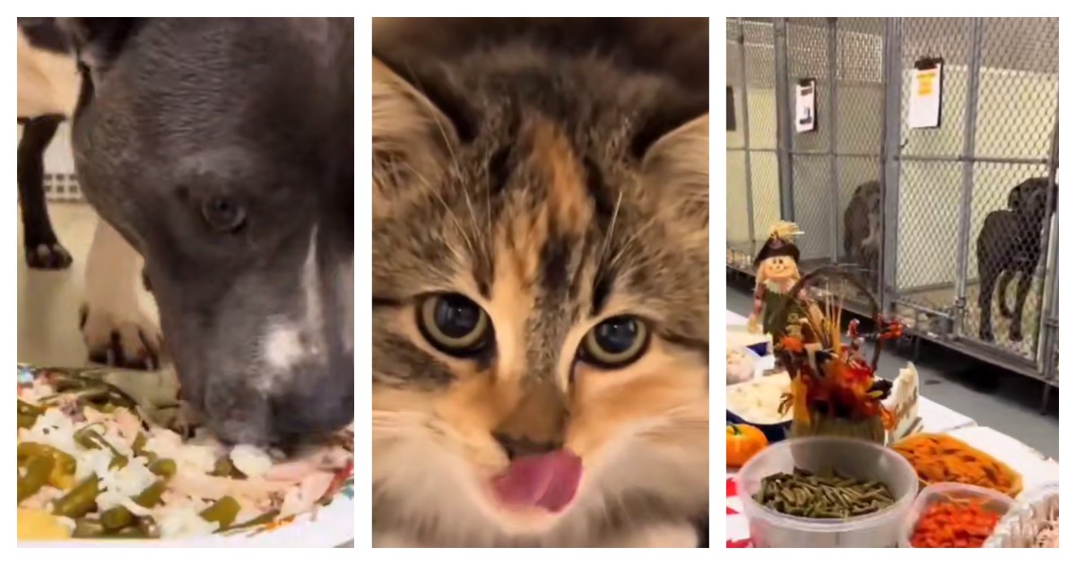 Приют для животных устроил праздничный ужин для кошек и собак