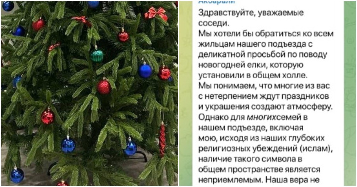 Но через пару дней в общедомовой чат ворвалось письмо от одного из собственников по имени Акбарали. Он сообщил, что для ряда семей, включая его собственную, наличие ёлки в подъезде оскорбительно с точки зрения ислама и попросил срочно убрать «этот символ». А позже добавил: «Давайте вместе подумаем, как можно перенести ёлку в менее спорное место или трансформировать декор в нечто общее и нейтральное, что не будет вызывать дискомфорта ни у кого».