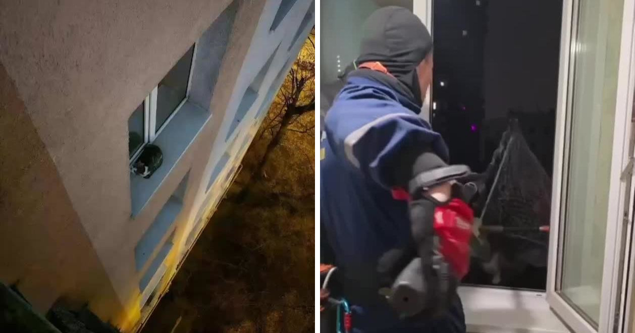 Спасатели работали из двух окон этажом выше: один зафиксировал кота петлей для ловли животных, другой подхватил его большим сачком. Спасенное животное передано хозяйке.