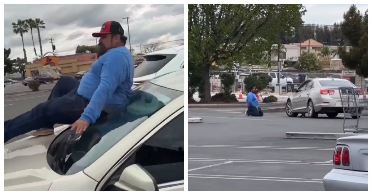 В Бейкерсфилде произошёл необычный инцидент: агрессивный мужчина оказался на капоте автомобиля. Водитель проехал с ним несколько метров, после чего мужчина упал на землю.