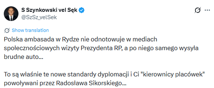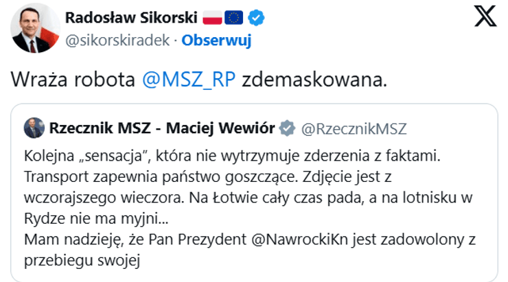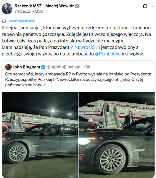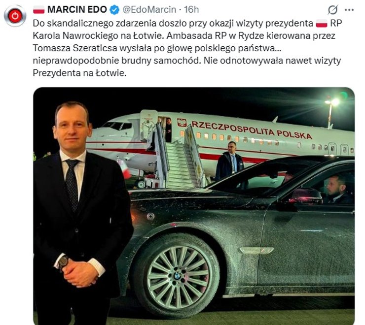 Авто BMW, которое прислали для президента Кароля Навроцкого, было забрызгано грязью | Соцсети Президент Кароль Навроцкий совершил рабочий визит в Латвию, где утром его приветствовал в Рижском замке президент Эдгар Ринкевич. Основными темами обсуждения между польским и латвийским лидерами стали вопросы безопасности в контексте продолжающейся войны на Украине, миграционное давление из Беларуси и ситуация в Балтийском море. Однако общественность больше заинтересовали не результаты визита, а фотография грязного представительского авто BMW, которое ждало Навроцкого у трапа его самолета после прибытия в Ригу. В польских СМИ по этому поводу разгорелась целая дискуссия, о которой написало и издание Onet. По мнению поляков, подобное является позором для польского посольства в Риге, возглавляемого Томашем Шератичем, и неуважением к президенту страны. Снимок грязного авто собрал свыше 930 тысяч просмотров и вызвал настолько сильную волну возмущения в интернете, что в дело вынуждено было вмешаться Министерство иностранных дел Польши. Відео дня «Очередная «сенсация», которая не выдерживает критики. Транспорт предоставляет принимающая страна. Фотография сделана вчера вечером. В Латвии постоянно идут дожди, а в аэропорту Риги нет автомойки… Надеюсь, президент Навроцкий доволен тем, как прошел его визит, потому что посольство Польши в Латвии на это влияет», — написал в Х пресс-секретарь министра иностранных дел Мацей Вевиор. Глава внешнеполитического ведомства Радослав Сикорский также кратко прокомментировал ситуацию. «Работа Министерства иностранных дел получила широкую огласку», — отметил он. Шимон Шинковский, известный как Сек, член партии «Право и справедливость» (PiS), также не стал молчать: «Посольство Польши в Риге не сообщает о визите президента Республики Польша в социальных сетях и отправляет за ним грязную машину… Таковы новые стандарты дипломатии и эти «главы дипломатических миссий», назначенные Радославом Сикорским…». Во время своего визита в Латвию Кароль Навроцкий встретился с солдатами польского военного контингента, дислоцированного на военной базе в Адажи. Он выразил большую гордость за службу польских солдат и заявил, что их присутствие в Латвии является доказательством того, что «Польша понимает свои обязательства и защищает восточный фланг НАТО». Глава государства, кстати, пока никак не отреагировал на шумиху вокруг грязного лимузина. Напомним, Навроцкий скорректировал план своего визита в Венгрию после того, как премьер-министр Виктор Орбан встретился с лидером РФ Владимиром Путиным. Польский президент решил не встречаться с главой венгерского правительства. Также сообщалось, что президент и премьер Польши поссорились в соцсетях. Навигация по записям Тайная операция со спецназом и бурным морем: как нобелевскую лауреатку везли в Осло»> Лукашенко запускает мигрантов в Польшу через вырытый в лесу туннель (видео)»>