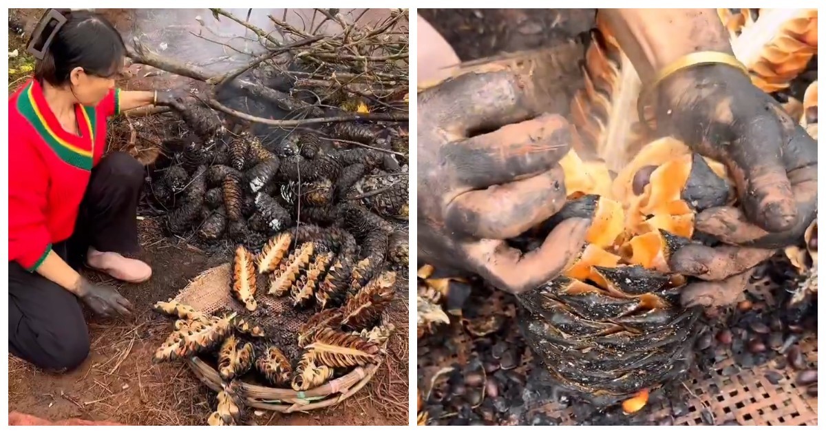 Под воздействием высокой температуры смолистые шишки обугливаются, их чешуйки с характерным треском раскрываются, освобождая орехи. Жар придаёт семенам насыщенный дымный аромат и глубокий, слегка поджаренный ореховый вкус. Готовые орехи часто подают горячими, а их извлечение из раскрывшихся шишек считается частью особого ритуала.